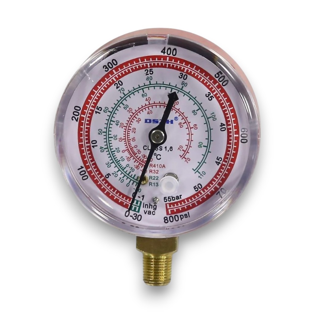 Манометр со стеклянной шкалой для хладагентов R22, R32, R134, R410 — измерительный прибор для контроля давления в холодильных системах. Используется при заправке, диагностике и обслуживании холодильного и климатического оборудования.