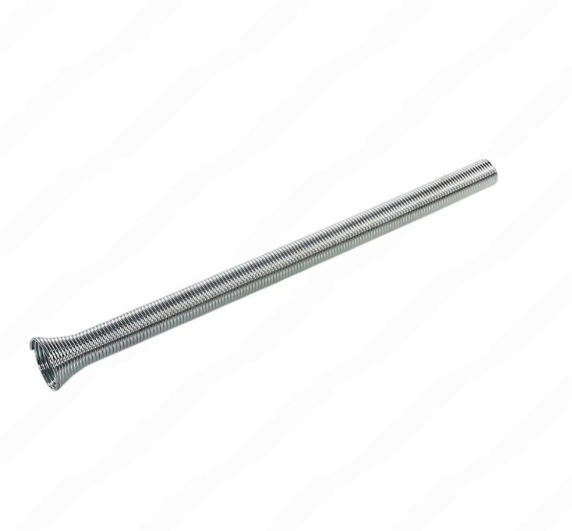 Пружинный трубогиб для медных труб – элементарная конструкция: это спираль, плотно свернутая из проволоки, чаще всего стальной. Цель такого нехитрого устройства – ограничение угла сгиба до безопасного для самой трубы: упругая проволока не дает создать острые углы, чреватые поломкой.
