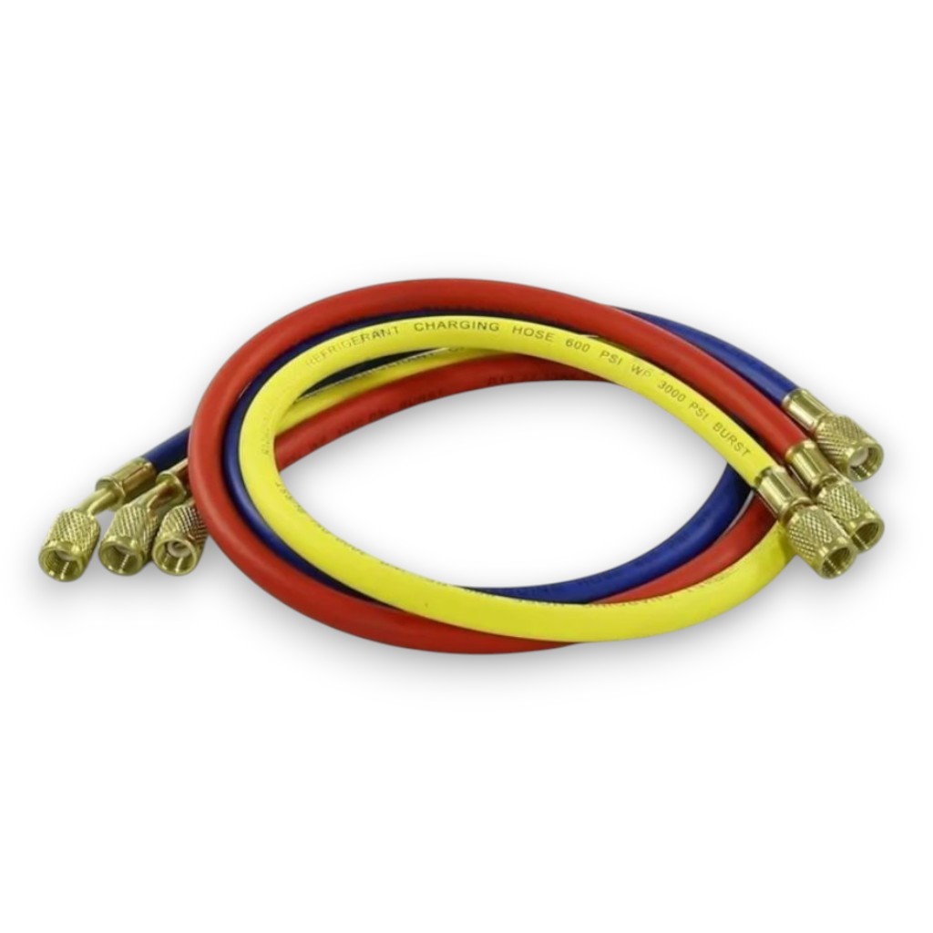 Шланги заправочные (сервисные, манометрические) для холодильных систем и кондиционеров, длина 90см, резьба подключения 1/4 дюйма SAE, рабочее давление 600-3000 Psi (41-207 bar). Комплект из 3 штук. Артикул 17859. Шланги предназначены для подключения манометрической станции к сервисным портам холодильной системы или кондиционера при диагностике, заправке хладагентом, вакуумировании. В комплекте обычно 3 шланга разных цветов: красный (высокое давление), синий (низкое давление), желтый (вакуум/заправка). Изготовлены из армированного каучука или синтетического материала с защитной оплеткой для прочности. Рабочее давление 600-3000 Psi обеспечивает безопасную работу с системами высокого давления. На концах шлангов установлены латунные фитинги с резьбой 1/4" SAE и самозапирающимися клапанами для предотвращения утечки хладагента при отсоединении. Длина 90см обеспечивает удобство работы. Универсальная конструкция для работы с различными хладагентами.