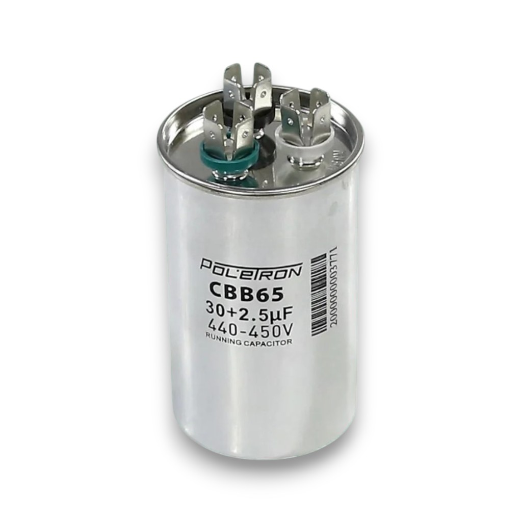 Совмещённый пусковой конденсатор CBB65 30+2,5 мкФ 450V в металлическом корпусе. Объединяет рабочий и пусковой конденсатор в одном корпусе. Применяется для компрессоров кондиционеров и холодильного оборудования.