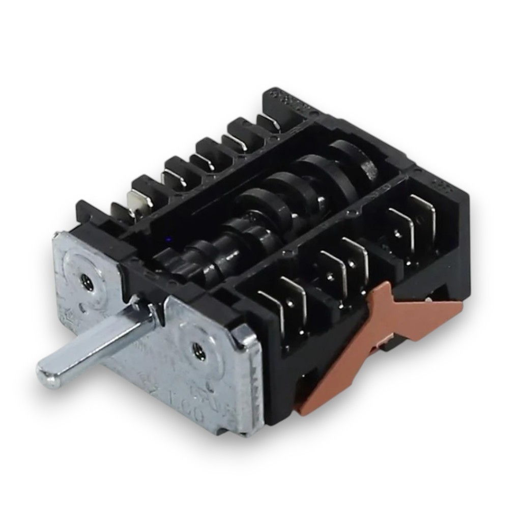 Переключатель (селектор, регулятор режимов) духового шкафа для электрических плит Candy и Hoover на 6 позиций (режимов). Модель EGO 46.26866.818. Артикулы: 91204784, 46.26866.818, COK300CY. Переключатель предназначен для выбора режима работы духовки: верхний нагрев, нижний нагрев, верхний+нижний нагрев, гриль, конвекция, выключено. Конструкция включает поворотный вал с контактной группой, которая коммутирует нагревательные элементы и вентилятор в зависимости от выбранного режима. 6 позиций обеспечивают различные комбинации включения ТЭНов и других элементов духовки. Переключатель устанавливается в панель управления плиты, управляется поворотной ручкой. Производитель EGO - немецкая компания, ведущий производитель электрокомпонентов для бытовой техники. Оригинальная запчасть обеспечивает точное соответствие электрической схеме и надежную коммутацию. Совместим с электрическими плитами Candy и Hoover различных моделей.