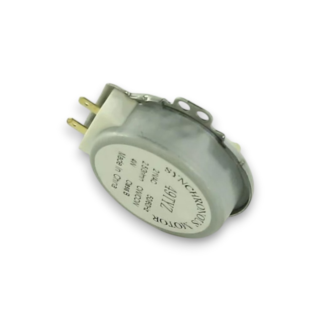 Двигатель тарелки СВЧ 2-х контактный - синхронный двигатель малой мощности. Компактное устройство с малым количеством оборотов и с большим усилием на выходе, поворачивающим поддон, нагруженный продуктами в течении продолжительного времени.